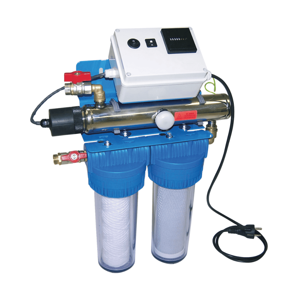 Idéal pour l’alimentation du lave-linge, les chasses d’eau et le lavage des sols. Grâce à la filtration au charbon actif et à la lampe UV (8 000 h), il élimine microbes, odeurs et impuretés. Équipé de deux cartouches filtrantes (20 µm et charbon actif) et d’un filtre 5 µm, il garantit une eau claire et propre. Débit : 470 l/h, conforme à la norme ACS.
