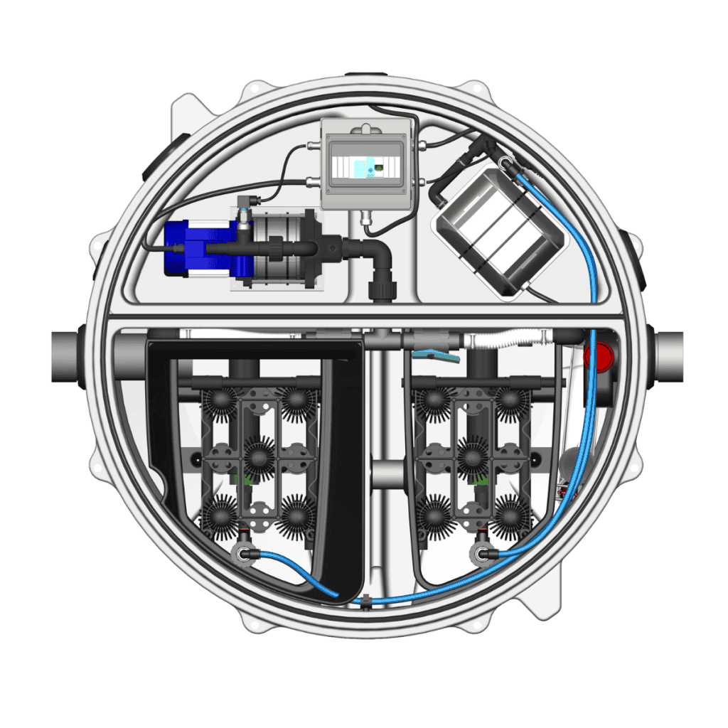 La microstation intègre un modèle déposé pour le support média, assurant une efficacité maximale dans le processus d’épuration. De plus, elle offre une flexibilité avec un surpresseur qui peut être soit déporté, soit intégré, selon les besoins spécifiques de l’installation.